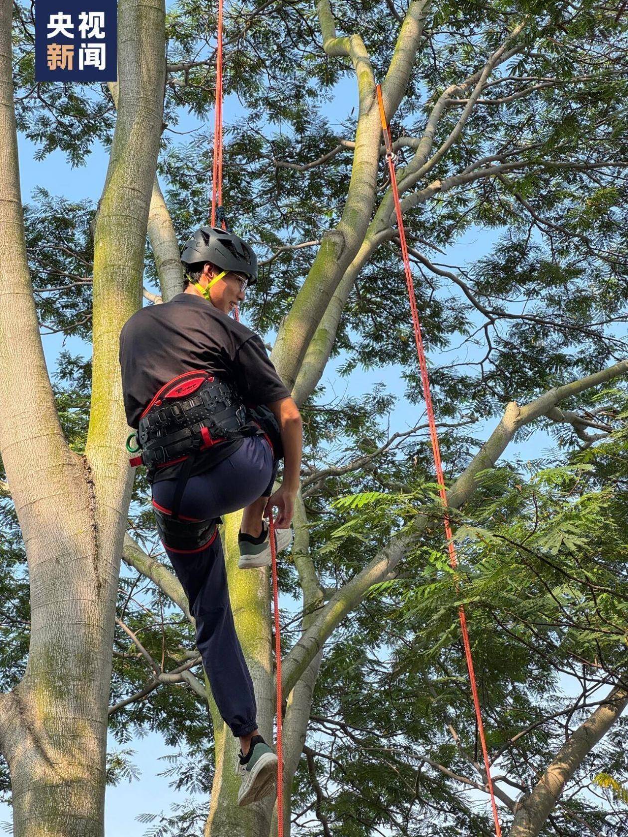 r郑达雄介绍:“攀树师不仅要熟练使用各类攀树装备与器械,还需了解树木养护、病虫害防治等树木学知识。同时,良好的运动能力和体力也是重要的职业素质。”